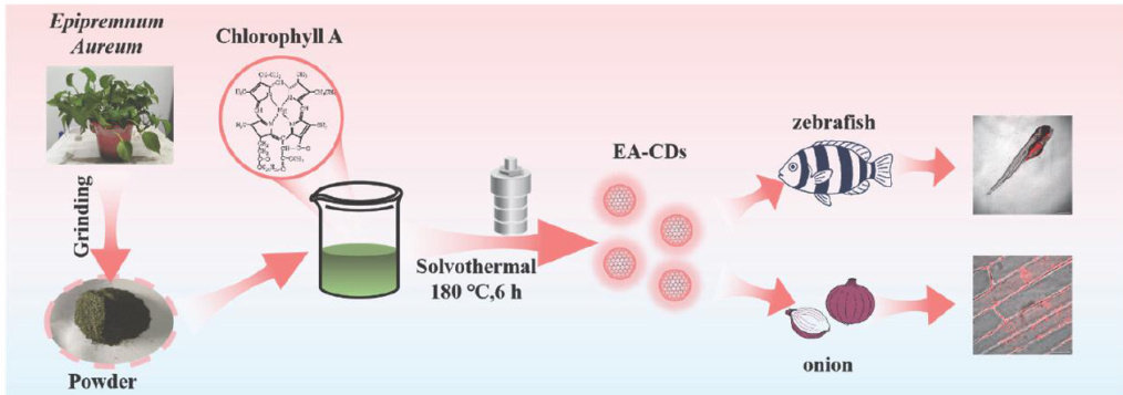 摘要:荧光碳点(CDs)已经广泛应用于生物体外/体内的荧光成像。然而,荧光CDs作为生物标记的特异性较差、而且在红光发射区域荧光量子产率(QY)较低,仍然是亟待解决的关键问题。本研究以天然植物绿萝叶片的乙醇提取液为前驱体,通过溶剂热“一锅”法合成了一种红色荧光碳点(命名为EA-CDs,λex/λem=400nm/660nm) 。EA-CDs具有小尺寸(平均粒径 3.9nm )、高荧光QY(在乙醇中 λem=660nm , QY= 15.4% 、低毒性(体外/体内)和良好的亲脂性(油水分离系数 LogP>0AA ,因此适用于体外/体内生物荧光成像和标记。实验结果表明该红光CDs不仅可以用于标记植物细胞膜,而且可以作为斑马鱼体内肠道荧光成像工具,有望成为一种通用型具有高荧光量子产率的生物膜红光染料。此外,本工作也为绿萝等观赏性植物的应用开拓了一种新思路。