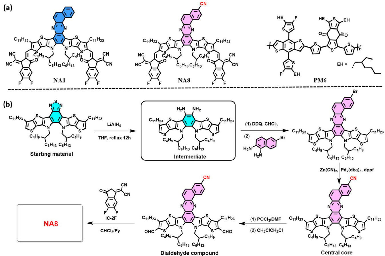 摘要:氰基化作为一种有效的分子工程策略,能够通过协同的电子效应和空间效应精确调控有机半导体的前线轨道能级与超分子组装行为。本研究设计并合成了一种新型氰基取代的小分子受体NA8,其基于苯并[a]苯嗪核心结构,利用氰基的高极性和线性构型来增强分子间作用并促进电荷分离。理论与实验结果表明,氰基取代在削弱分子内电荷转移作用(引起吸收蓝移)的同时,显著提升了分子间作用和堆积行为,使NA8表现出相对于中心核无氰基取代的对比分子NA1更高的结晶相干长度。受益于这一分子层面的优化,采用绿色溶剂邻二甲苯制备的PM6:NA8器件实现了 19.04% 的优异光电转换效率(对比PM6:NA1的 15.14% ,其性能提升主要归因于更高的短路电流密度 (27.35mAcm-2 和填充因子 (78.3%) 。进一步的原子力显微镜(AFM)、掠入射广角X射线衍射(GIWAXS)和瞬态吸收光谱(TAS)表征证实,NA8基器件的优异性能源于更理想的相分离形貌、更高的载流子迁移率以及更快的激子解离过程。尽管开路电压略有降低 (0.889Vνs. 0.914V) ,这与氰基引入后C-C键振动增强所致的重组能升高相符。综上,核心氰基化为开发兼具高效率与非卤代溶剂加工兼容性的受体材料提供了一条有效途径,并为新一代有机光伏的分子设计提供了参考。